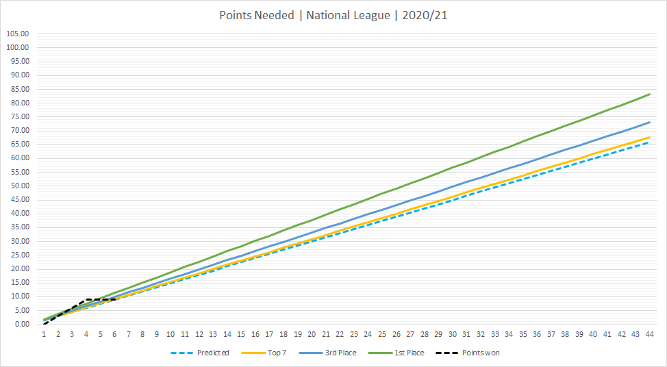 Points needed and with 6 games played Notts have a PPG of 1.50 which would see a return of 66 points over 44 games. That leaves an estimated finish just outside of the play off's compared to target.