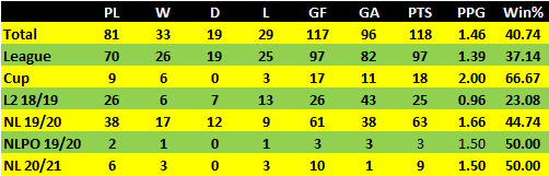 There is a worrying trend starting to appear of goals conceded in the second half of games. Notts are averaging 0.50 goals per second half but conceding 1.17 goals per second half. This would indicate that if that trend continues and Notts do not hold the lead at half time there is a 57% chance they will concede and lose the game.