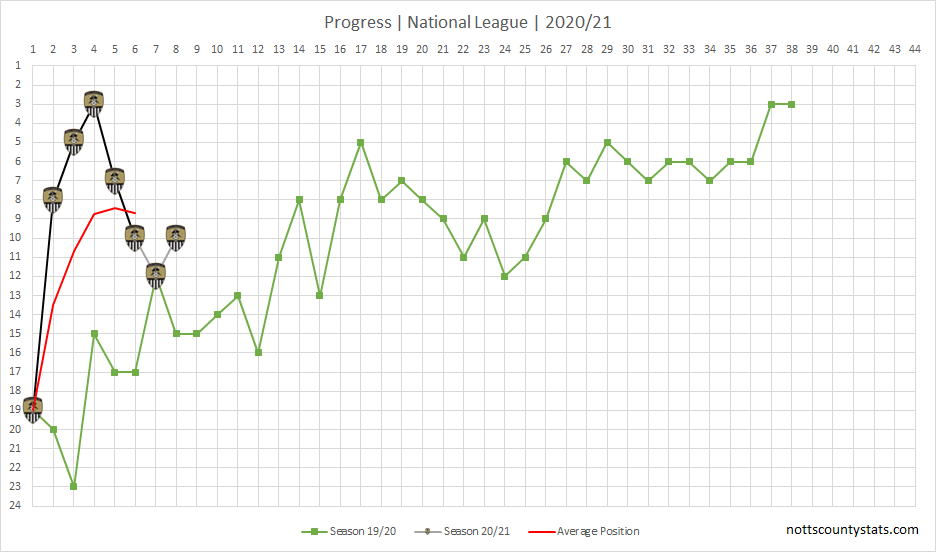 Points needed and with 8 games played Notts have a PPG of 1.620 which would see a return of just over 71 points for 44 games. You can see from the chart below that would project a play off finish based on target points set. Although not currently in a play off position it is likely at this stage that there are teams in the top 7 that are over achieving.