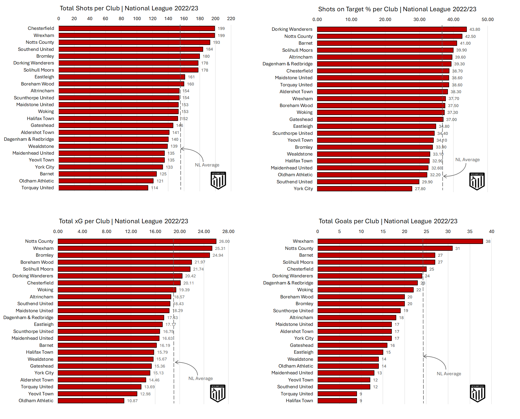Wrexham lead the way with goals scored averaging 2.92 goals per game. Notts County, Barnet, Solihull and Chesterfield are the only other teams whose goals tally for the season so far is above average for the league.