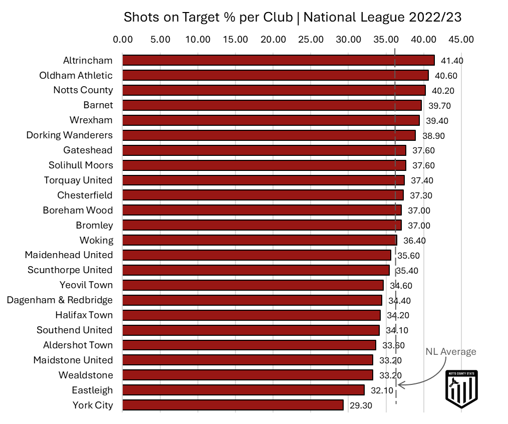 Also, Oldham create the third worst amount of chances in the league but score highly for shot accuracy, just behind Altrincham.