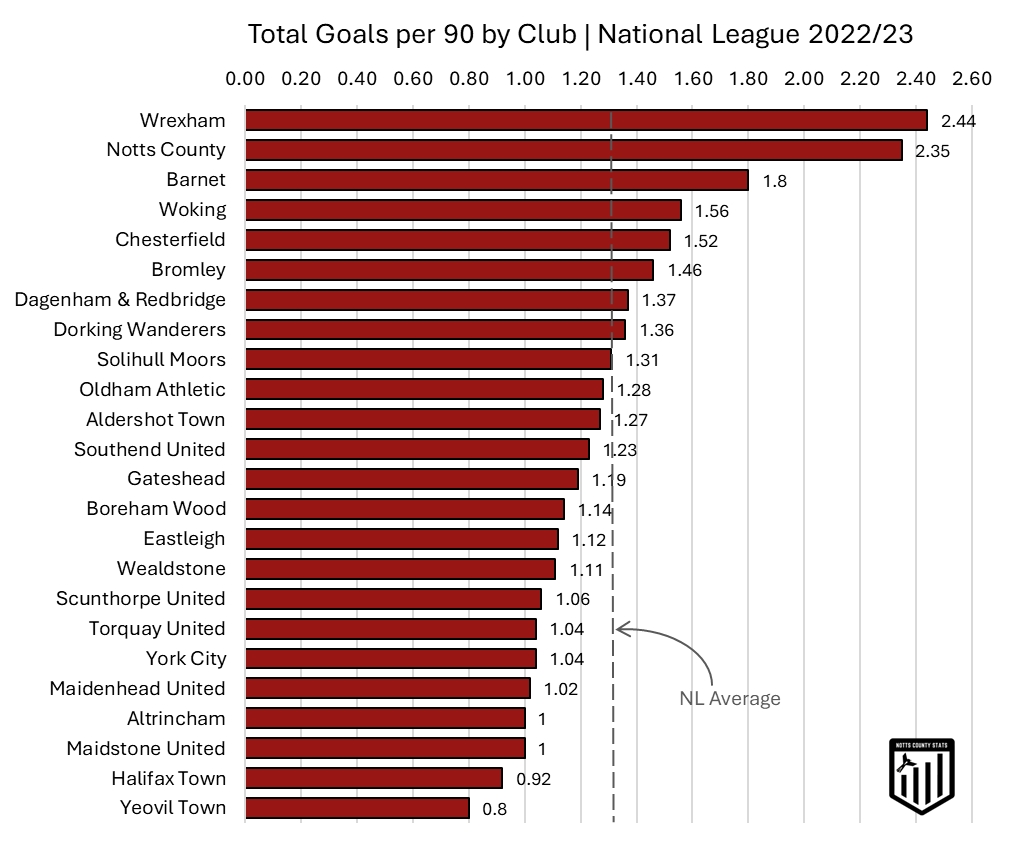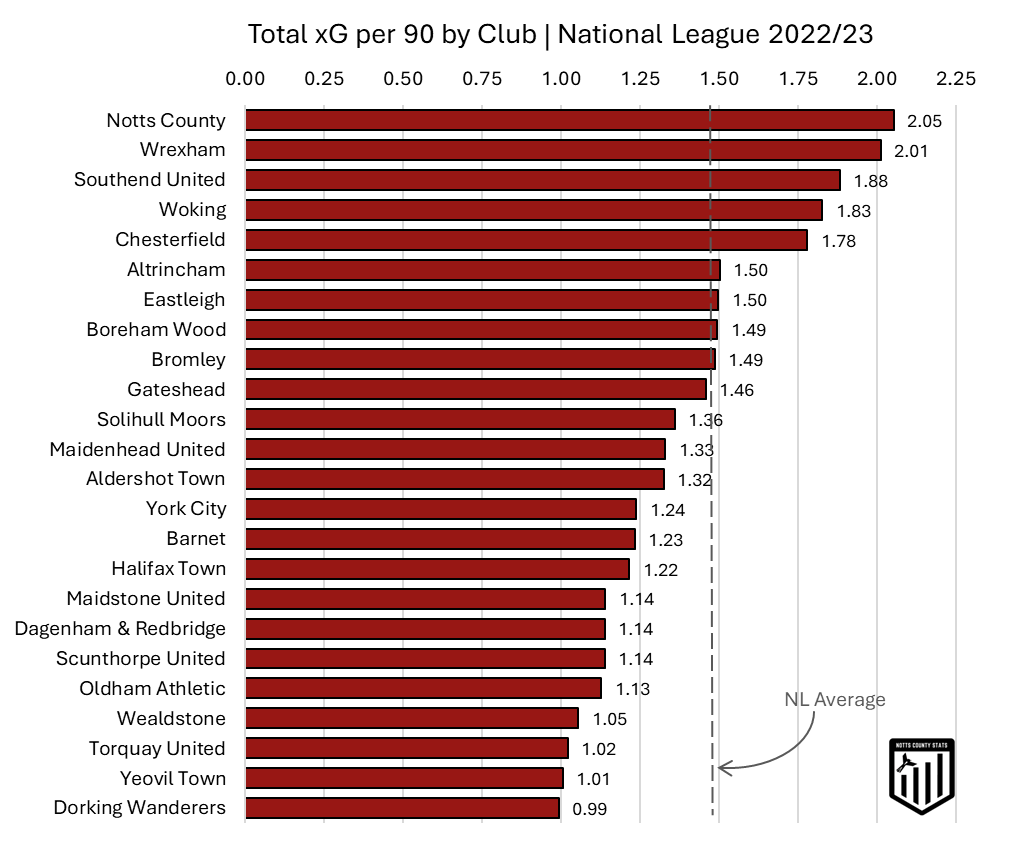 Notts County have an average xG 2.05 per 90 and are averaging 2.35 goals per 90 so scoring slightly higher than expected. Wrexham on the other hand are scoring 0.43 more goals per 90 than their xG per 90, that's equivalent to scoring 13 goals more than expected for the season providing some insight into how they find themselves top of the table.