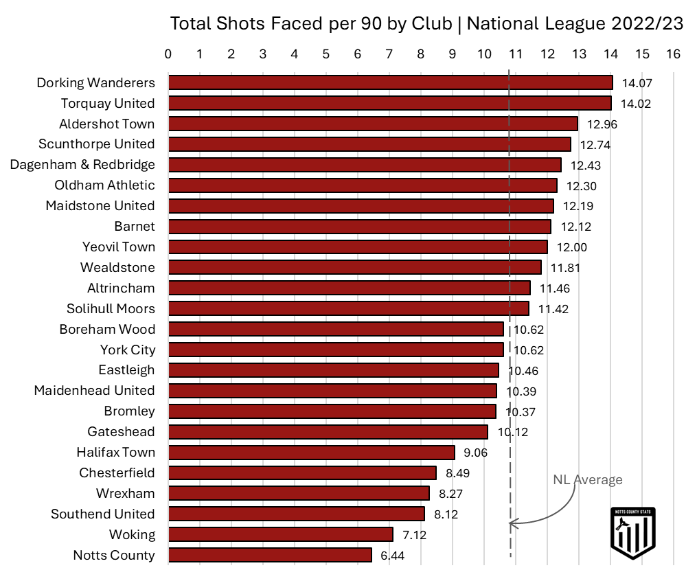 Moving onto the defensive stats now and we mentioned above about Dorking struggling in attack, well as we can see from below they now invite the most shots on their goal in the league at 14.07. This is just 0.05 more than Torquay.