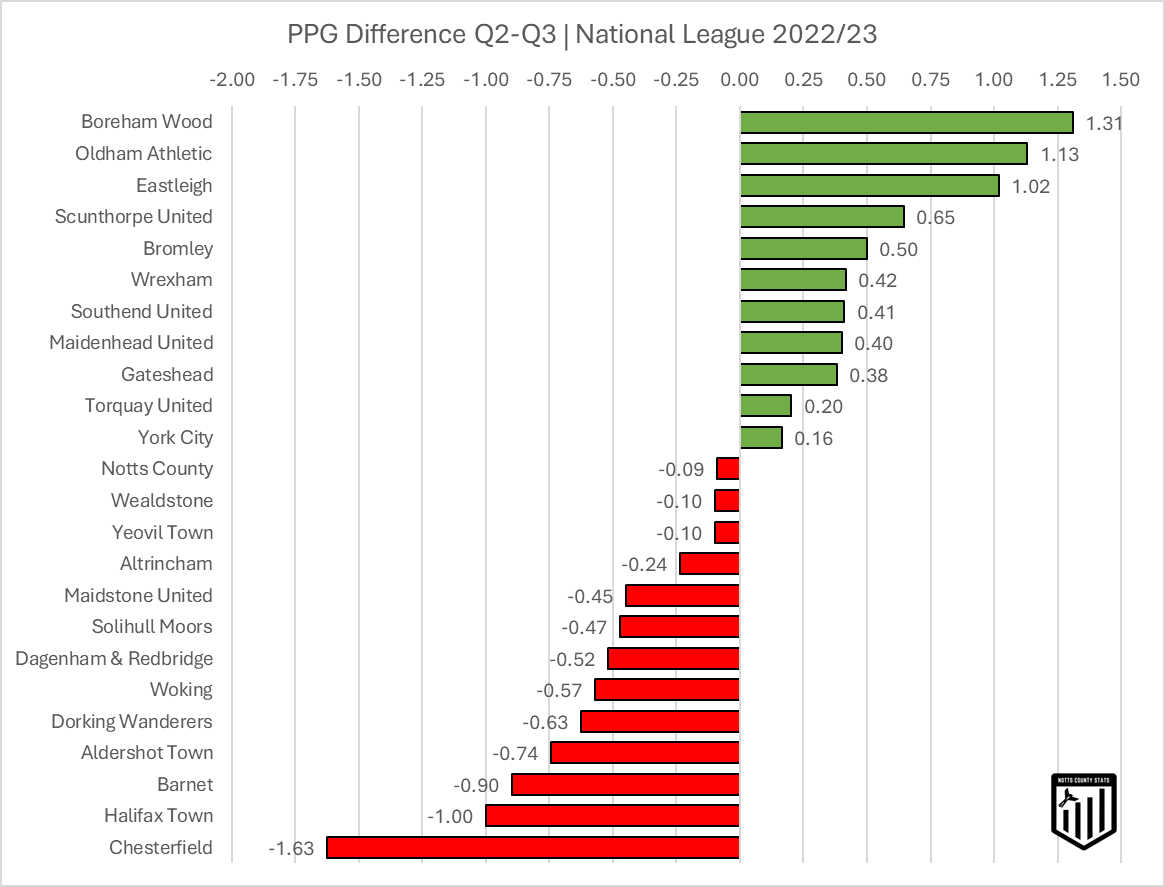 Boreham Wood are the big movers in this quarter increasing their PPG by an incredible 1.31 having only recorded 0.60 PPG in Q2.
