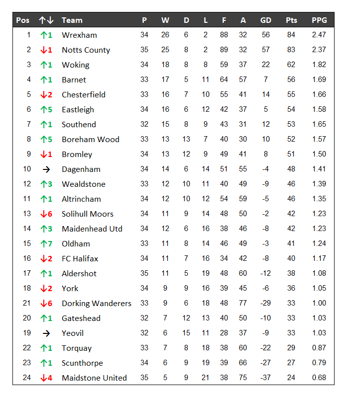 Notts County held top spot for much of this period, however defeat at home to Dagenham has opened the door for Wrexham who now have top spot by a point and with a game in hand meaning the title is now theirs to lose. As a certain BT Sport pundit might say, "Good luck shifting them now!".