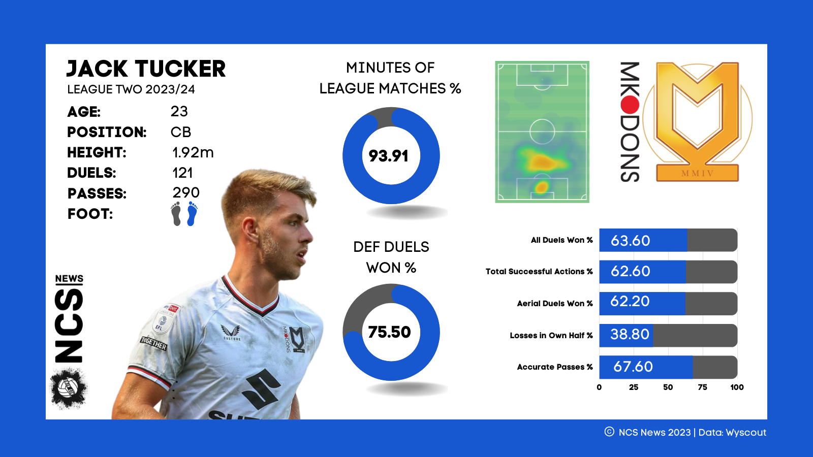 The midfielder behind the 2 forwards is much deeper, playing more as an 8 ahead of the 2 holding midfielders, rather than being a link man for the forwards, who themselves are given plenty of licence to play with attacking freedom. But it’s the back 3 which looks the most different. Unlike Notts, they are a narrow, compact defensive 3, with the middle CB staying in line rather than dropping deeper, like Brindley has done for Notts this season. At the heart of this back 3 is 23 year old Jack Tucker, who has had a strong start to the season. An aerial presence at 6’4”, Tucker has started all 6 of MK Dons League games so far. Tucker plays the role of distributor, launching attacks with his range of passing; he has played the most accurate long balls of any MK Dons player, 7.2, 4th most in the entire division. He is often used to bypass the building phases of play, looking to hit the MK Dons front 2 with a long pass. This may be something they look to use this weekend, looking for the long ball to catch Notts out in the defensive transitions, something Notts have struggled with at various points this season.