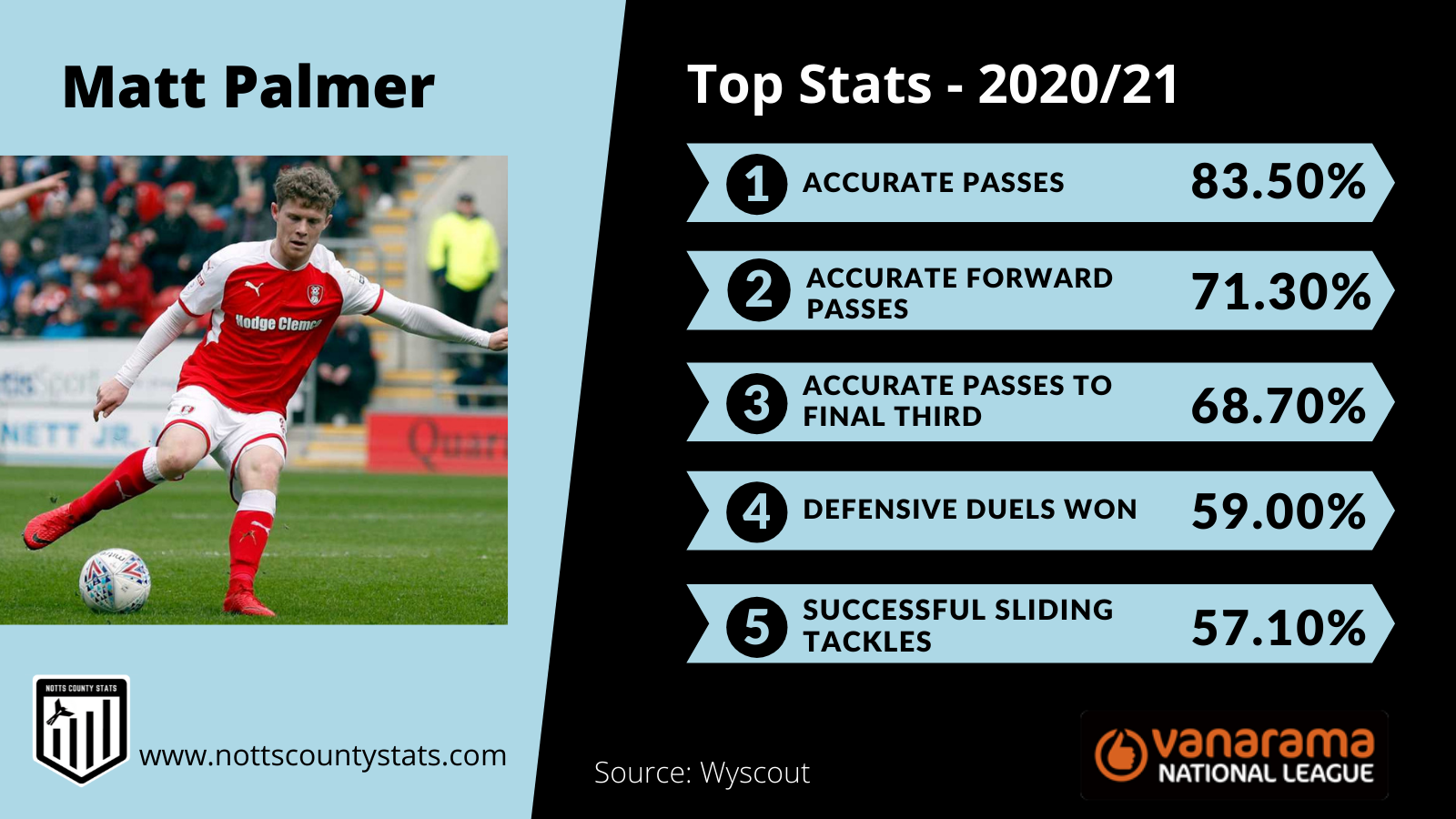 Palmer is an energetic central midfielder and will most likely fill the role left by Jake Reeves. He has a high pass completion rate and isn't afraid to make a challenge. It was good to hear that Palmer had received offers from EFL clubs but was won over by Ian Burchnall and appears fully invested in the "project" at Meadow Lane.