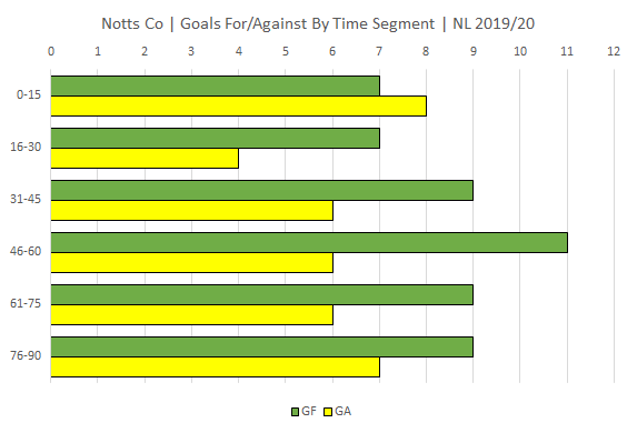 Goals scored and conceded per 15 min segment for both Notts and Barrow. Segments 31-45 mins and 76-90 mins include goals scored in added/injury time.