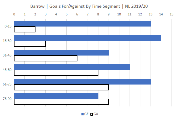 Notts continue to be at their most vulnerable in both the first 15 and last 15 mins of a game and at their most potent in the first 15 mins of the second half. It looks like Barrow like to come out of the traps fast scoring most and conceding fewer of their goals in the early stages of a game which Notts fell victim to in the first encounter at Meadow Lane with two of the three Barrow goals coming in the first 13 minutes.