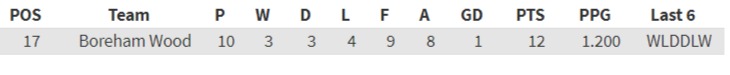 Boreham Wood despite currently sitting 17th in the league actually have the second best defence so far conceding just 8 goals in their 10 games played, but equally have only scored 9.