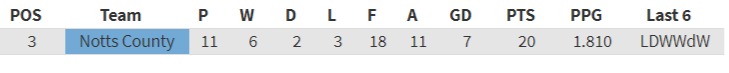 Notts PPG so far is 1.810. This compares to an xPts total of 1.841 which would indicate that performances have been pretty much on a par with expected results.