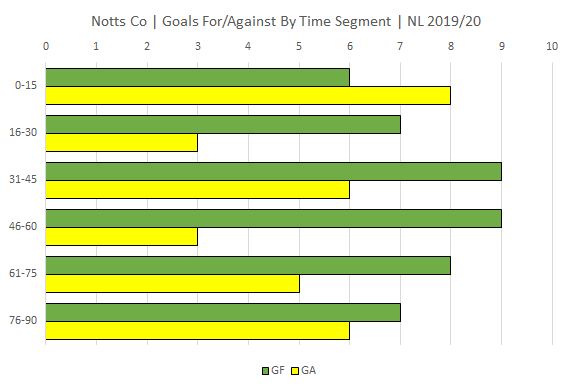 Notts appear to be at their most vulnerable in the first 15 mins and at their most potent just before and after the half time interval.