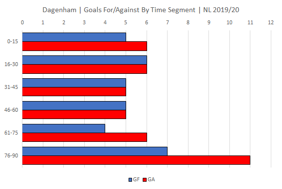 Goals scored and conceded per 15 min segment for both Notts and Dagenham. Segments 31-45 mins and 76-90 mins include goals scored in added/injury time.