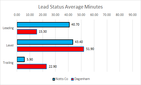 Notts have held the lead for just over 40 minutes on average in all games played so far this season with Dagenham managing to lead for just over 15 mins on average,