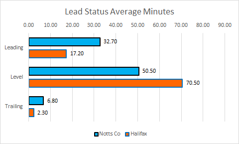 Halifax's defensive strength is further displayed in the lead status table below which shows they only spend 2.30 minutes trailing per game on average and over 70 minutes per game on level terms.
