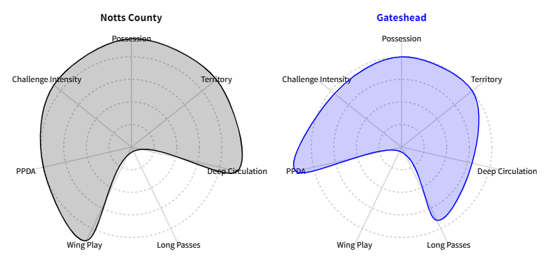 Looking at the playing style rankings and despite Gateshead's lowly league position they actually rank highly in many of the construction and challenge intensity stats. However, they rank the lowest for wing play which might provide an indication of how they might shape up against Notts on Tuesday night.