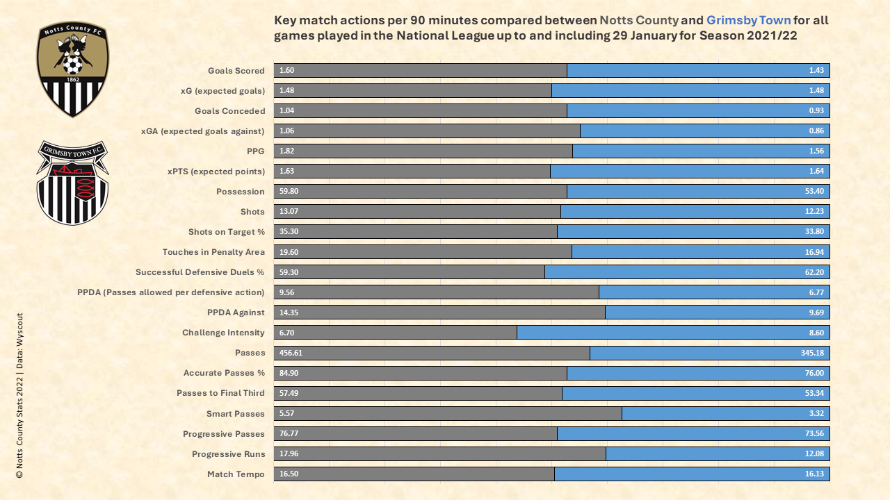 Not much to choose from between the two teams. Notts look to be slightly better on the construction stats but Grimsby score well on PPDA and Challenge intensity. Essentially expect them to press hard to force Notts into ball losses.