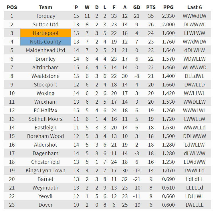 Pools currently sit 3rd in the league, just 1 point ahead of Notts but having played 2 games more and with a lower GD and PPG.