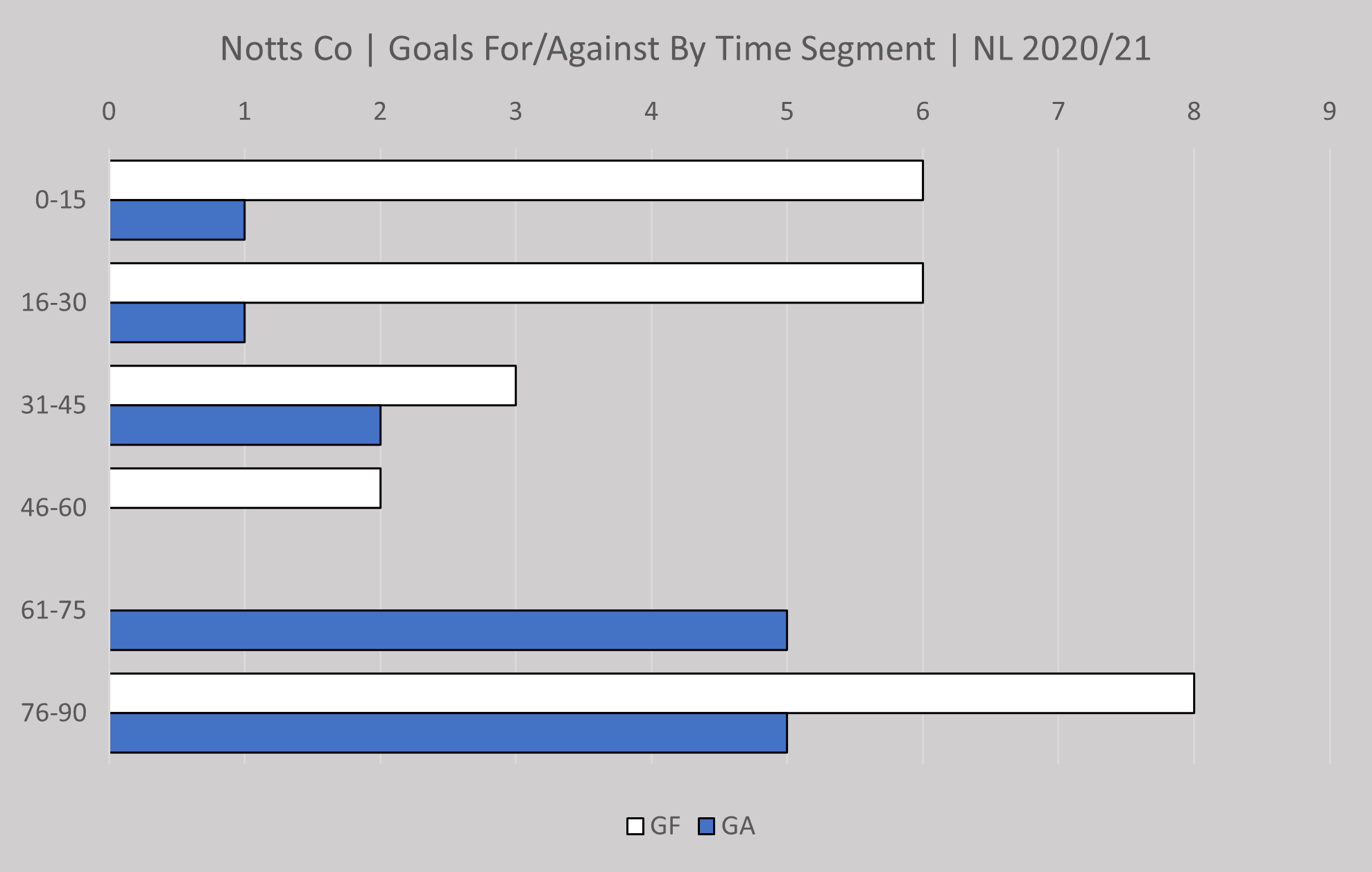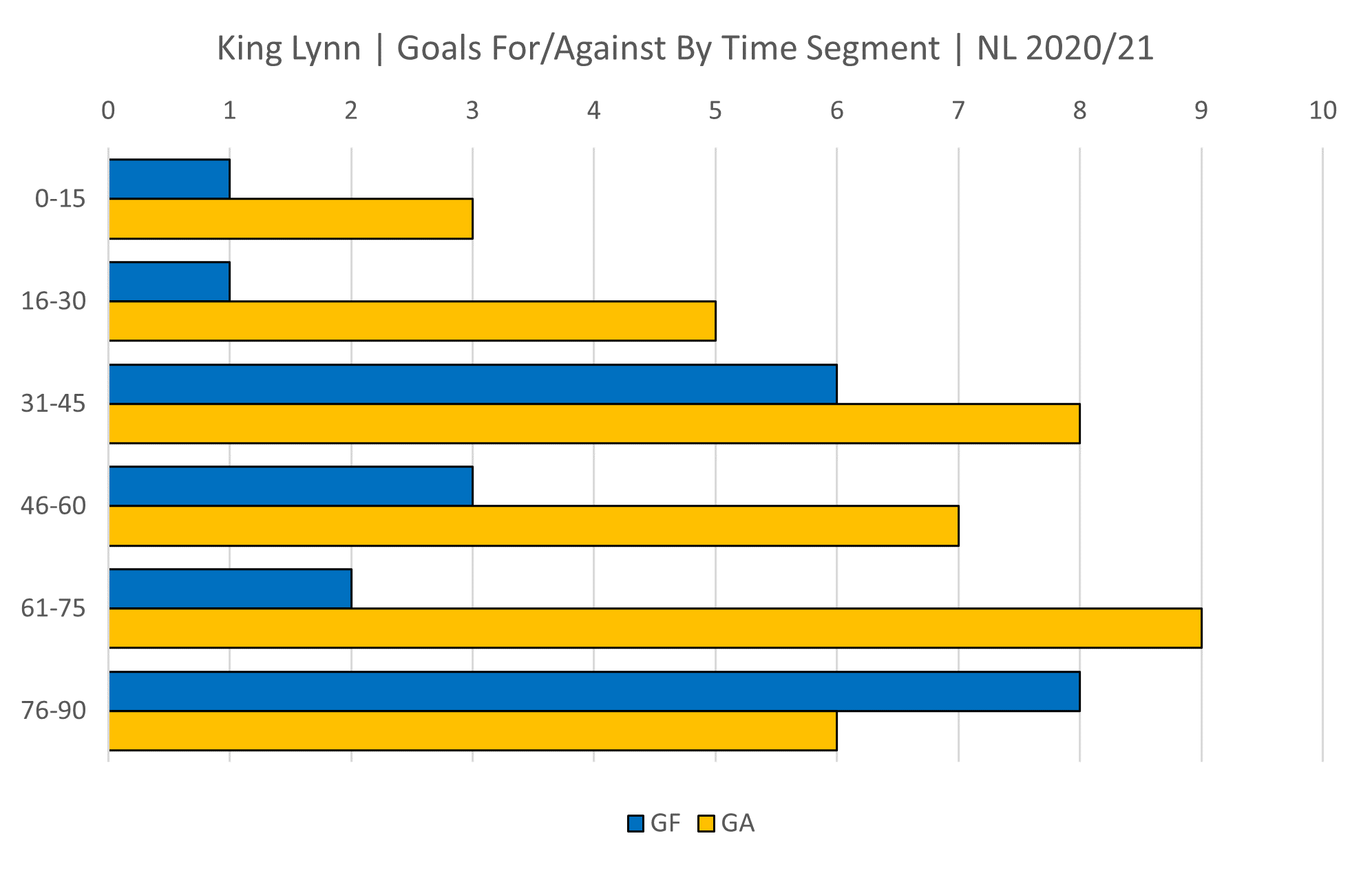 Goals by time segment for King Lynn and despite a slow start to games it appears the goals start flowing the longer the game goes on.