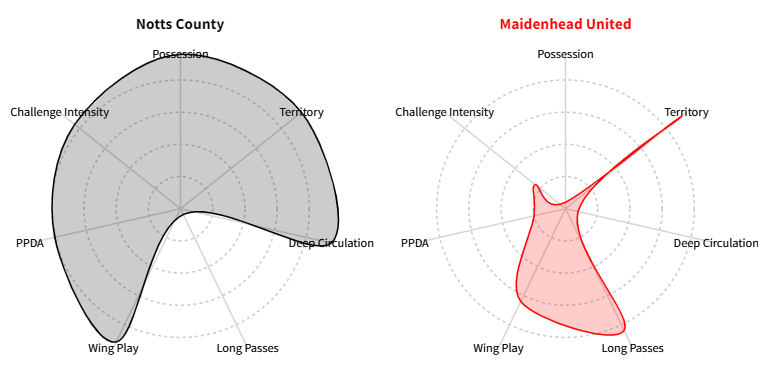 By contrast Maidenhead appear to have an aversion to keeping hold of the ball but score very highly in territory by completing a lot of progressive actions into the final third, mainly on the break.