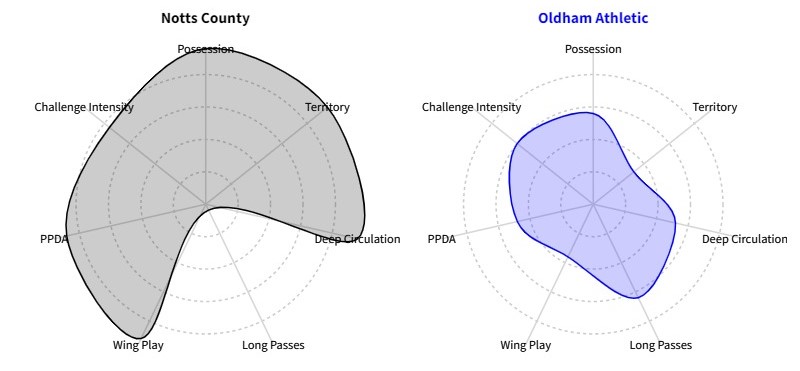 Playing style rankings continue to show Notts excelling in most areas except long passes. Despite their current lowly position Oldham are ranked above average for pressing/challenge intensity and the long ball passes suggesting they will play a little narrower and a tad more direct than Notts.