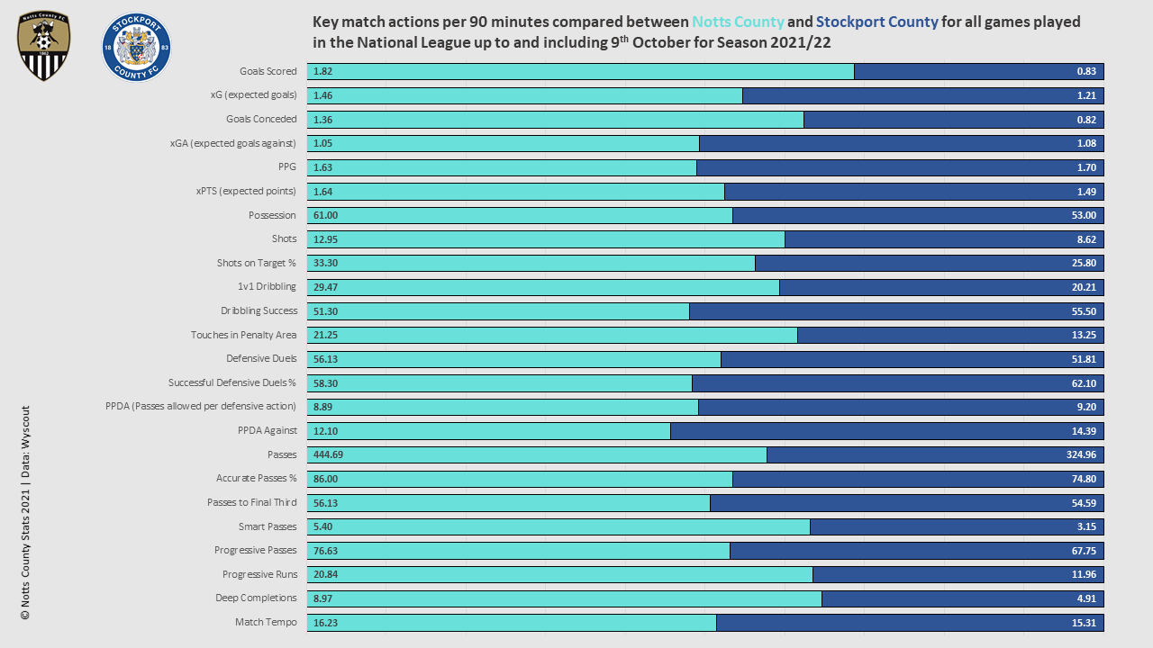 Key match actions compared for the season so far. Despite there being just one point and one place separating the two teams in the National League table Notts have the edge on Stockport in attacking and construction actions.