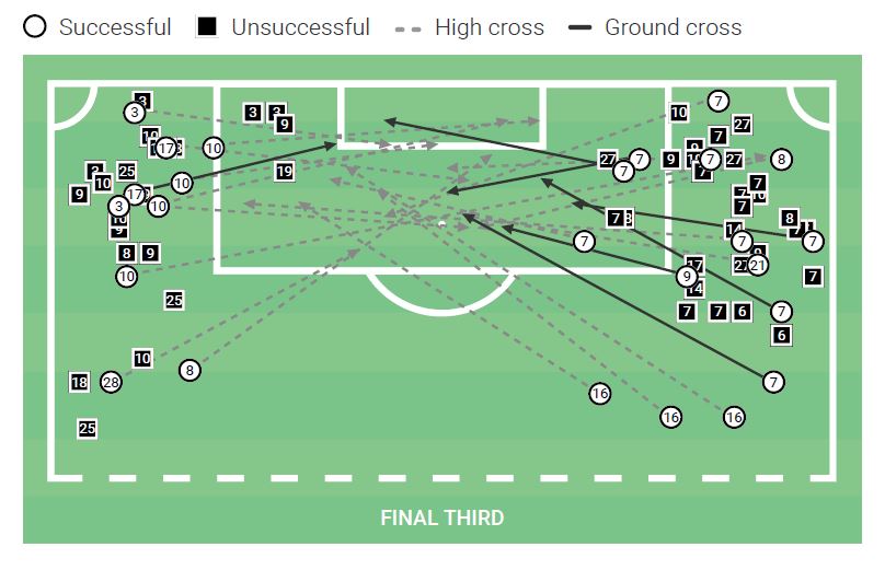 Below you can see the areas where Stockport threatened the final third from crosses during their last National League match at home to Aldershot which they won 1-0. It is quite clear that they are slightly busier attacking down the right compared to the left.