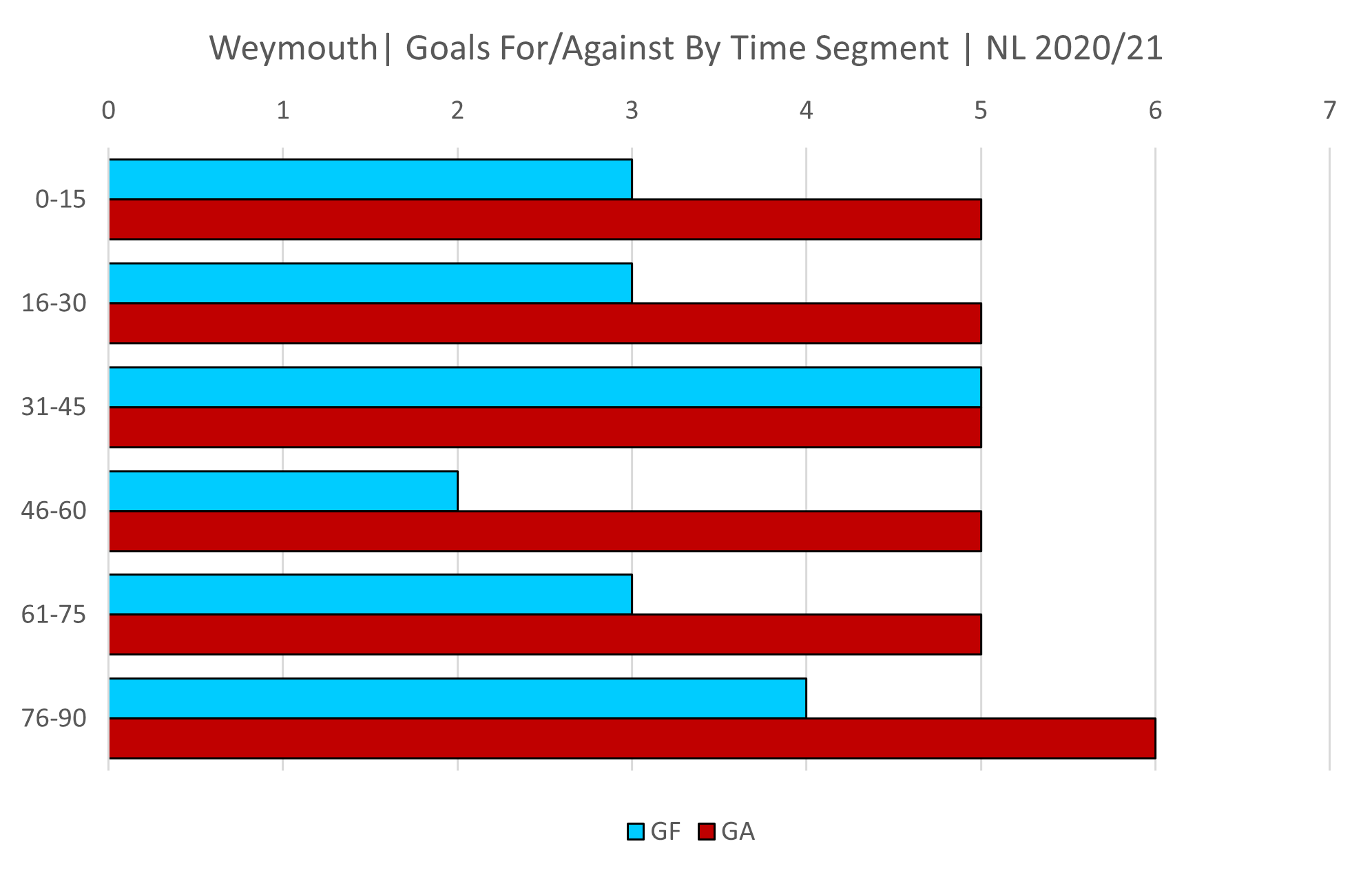 Goals by time segment for Weymouth and with 20 goals for and 31 goals against it's difficult to see if there is any pattern to their play other than they have conceded an equal amount of goals at every time segment within the 90 minutes.