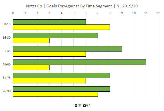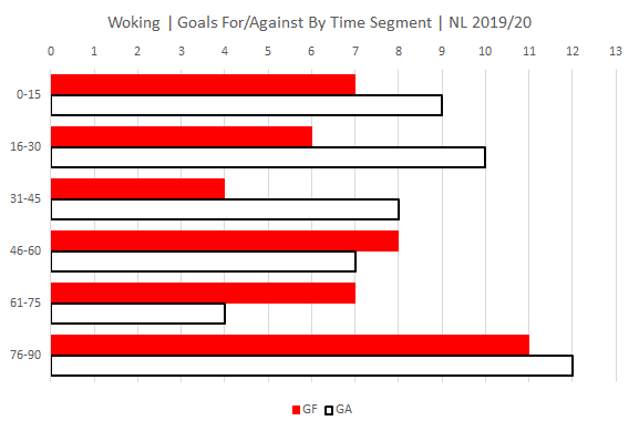 Notts continue to be at their most vulnerable in the first 15 mins and at their most potent just before and after the half time interval. Woking are at their most vulnerable in the first half and last 15 minutes.