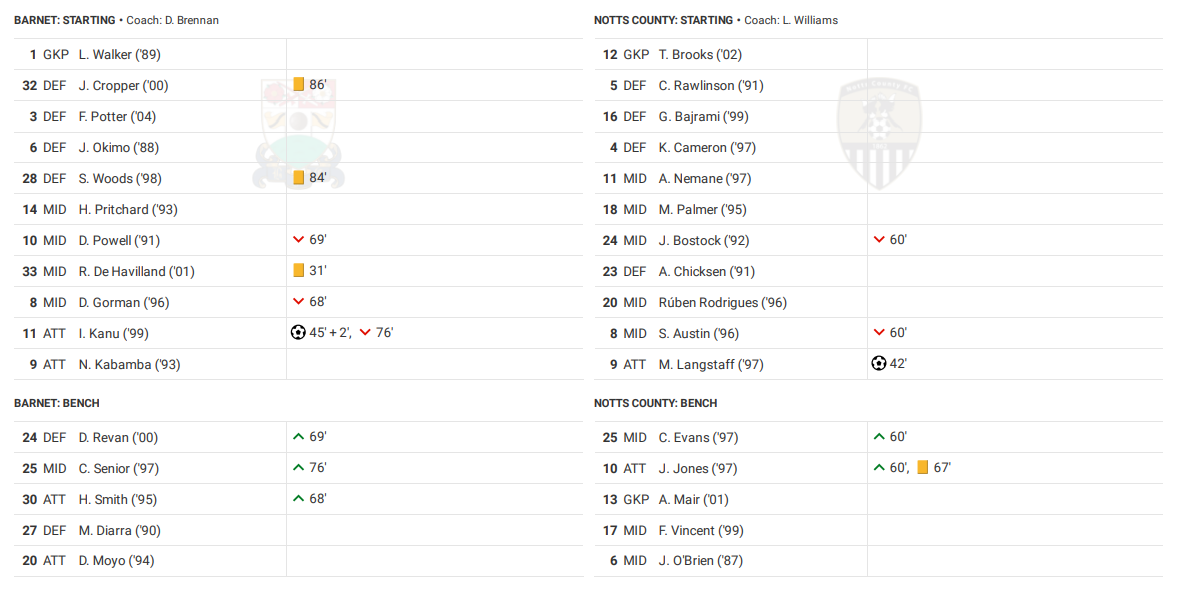 With the first half almost drawn to a close Barnet won a throw high up the pitch. Right back Cropper went to take, and his incredibly long and flat throw wreaked absolute havoc in the Notts box. It went straight onto Idris Kanu’s head, and his effort flew like a bullet, hitting the bar and going in to level the scoring. A disastrous end to the half which sent the sides in level.