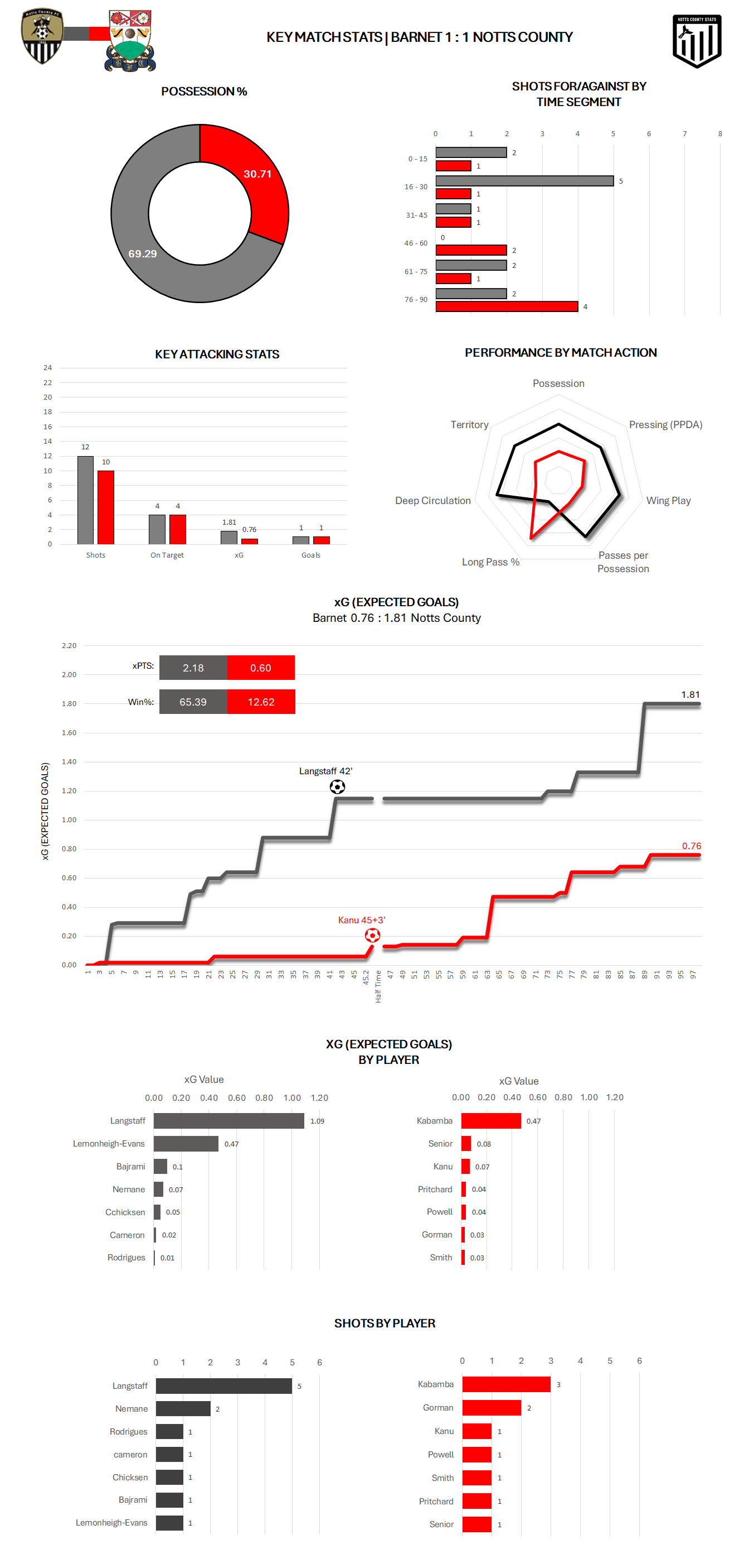 The game then exploded to life on the stroke of half time, with Notts finally getting the breakthrough they deserved. A wonderful team move saw Notts move the ball from back to front, manipulating the Barnet defence out of position. The ball was worked to Macaulay Langstaff, who this time made no mistake, lashing home his 37th goal of the season. Notts regained top spot, with Langstaff eyeing 2 goalscoring records too.