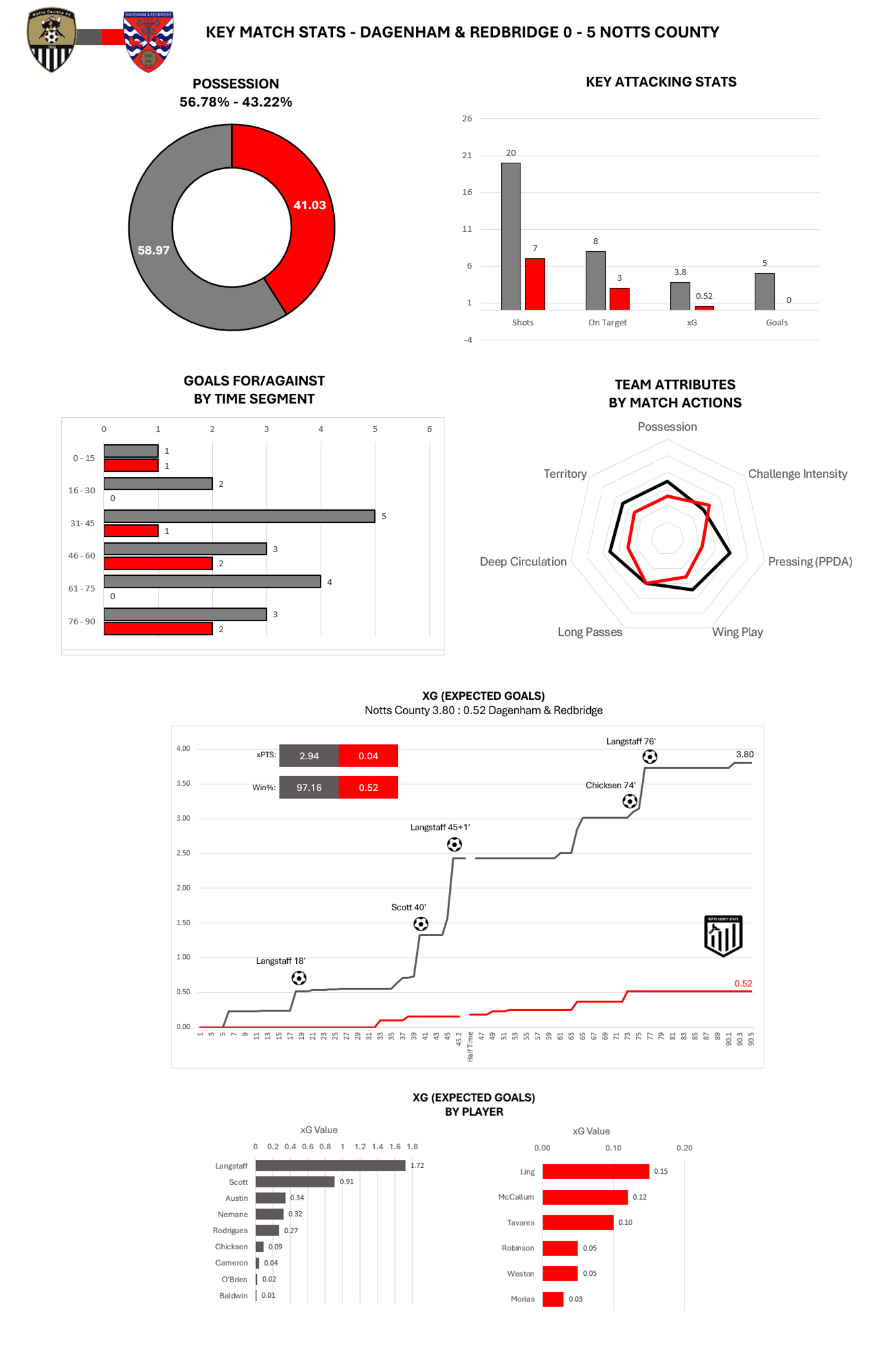 Notts had a total of 20 shots on goal compared to 7 for Dagenham and based on the overall xG Notts had an expected points tally of 2.94 and an expected win percentage of 97.16% Again, these are the highest xPTS and xWin% win can remember seeing for a Notts team.
