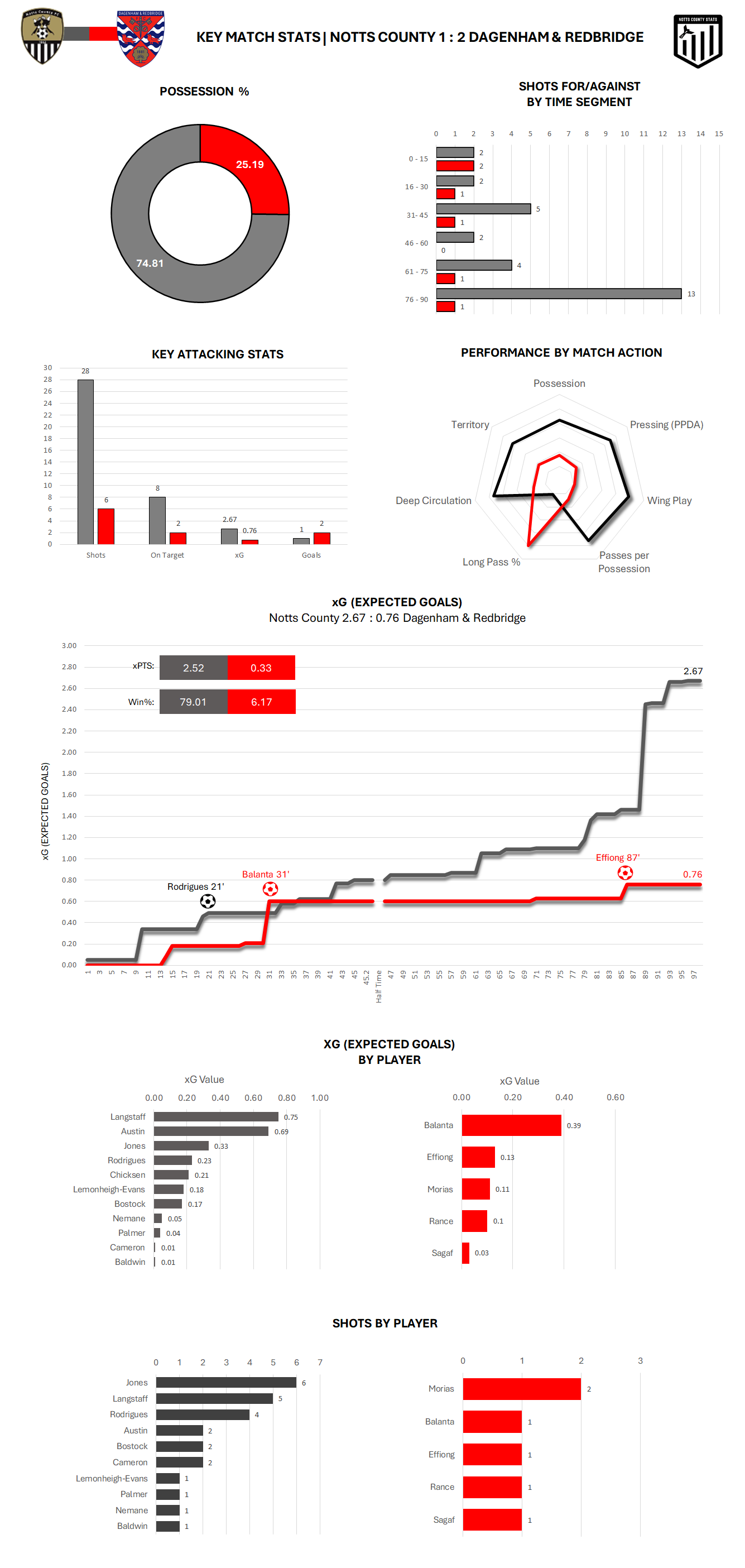 Ten different Notts players all had a go at breaching the Dagenham defence with Rodrigues the only one to succeed. Austin's close range effort that was cleared off the line was the highest xG value of the game recording 0.63.