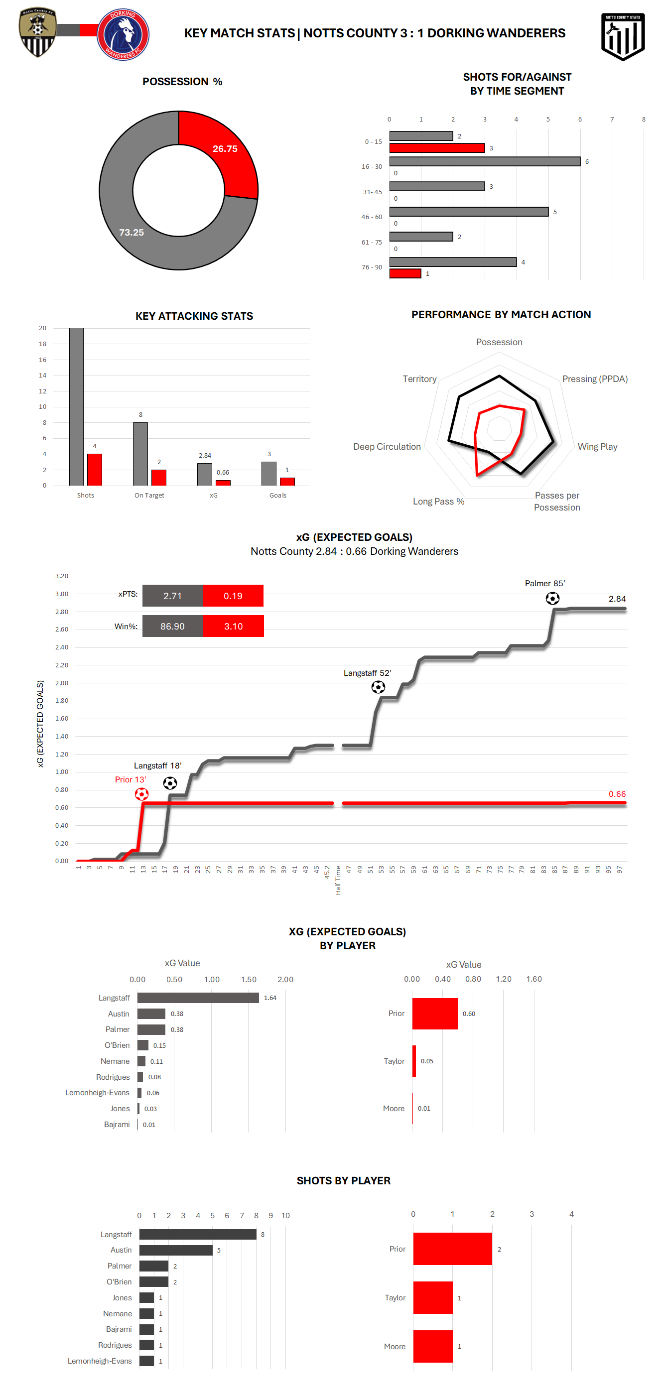 Based on the xG data Notts' xPTS came in at a whopping 2.71 compared to just 0.19 for the visitors. This is further confirmed by expected win percentage of 86.90% for Notts and just 3.10% for Dorking.