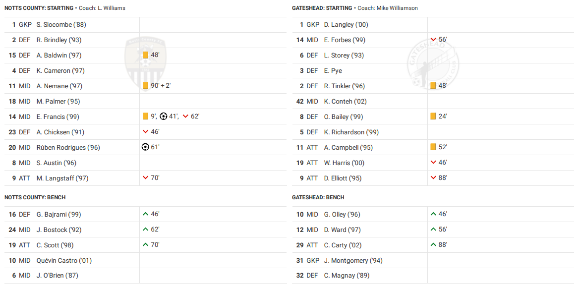 Notts grabbed a deserved 2-0 win over struggling Gateshead on Tuesday night, but it was an evening marred by injuries and poor quality officiating. Fortunately, Notts’ social media have subsequently announced that neither of the injuries sustained by Macaulay Langstaff and Adam Chicksen are serious, but had the referee gained some control of the action it's likely neither would have occurred.