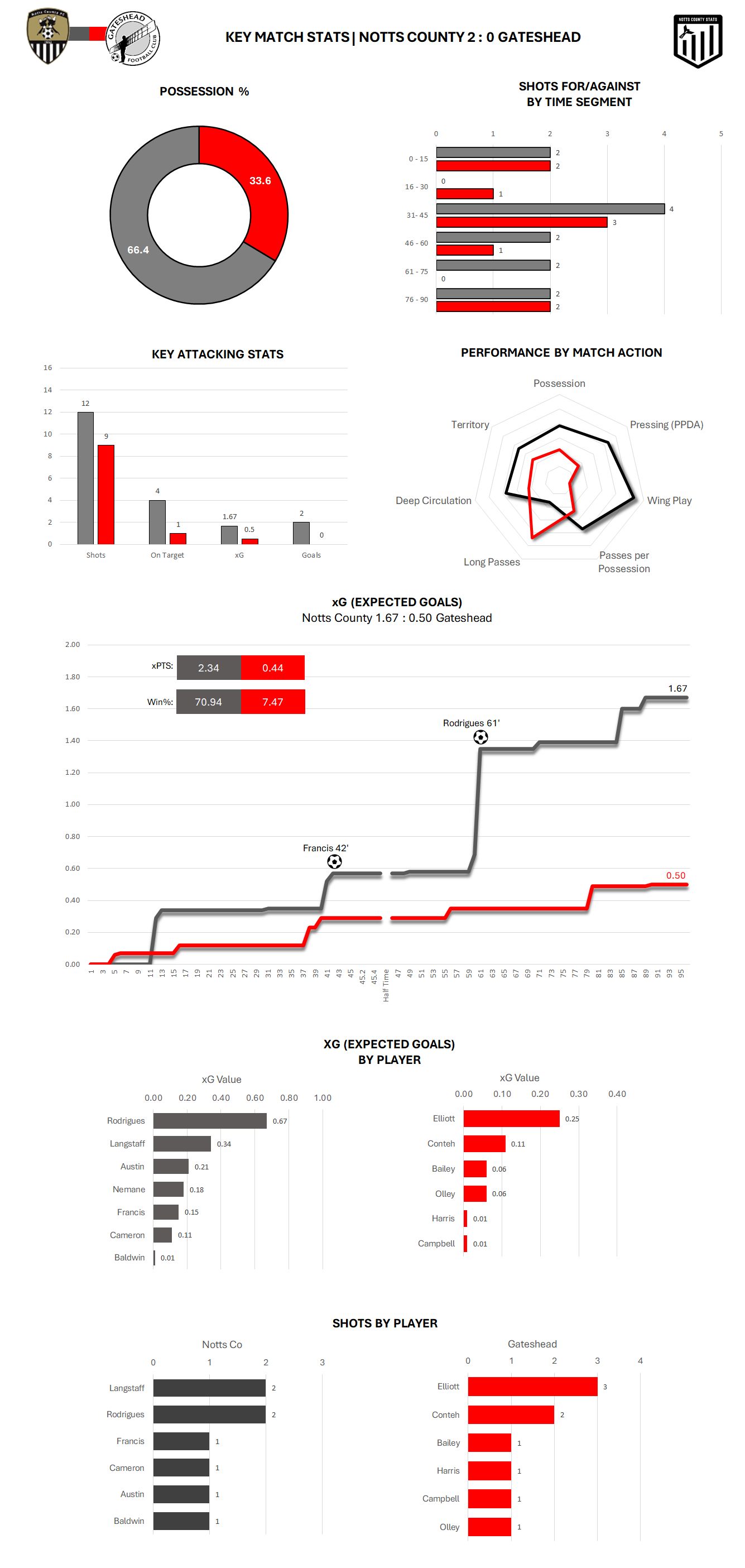 Notts had the much better chances seeing them record a higher xG, helped massively by Rodrigues' goal which scored an xG value of 0.66. Based on the number and xG value of the chances created Notts' expected points for this game came out at 2.34 compared to just 0.44 for the visitors. Notts also recorded over 70% expected win percentage compared to a lowly 7.47 xPTS for Gateshead.
