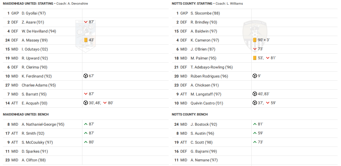 The contest was heating up, with Palmer receiving a rare booking, and Luke Williams saw it fit to introduce Sam Austin, with him entering the action in place of goalscorer Castro. Maidenhead continued to pressure though, and it paid off as they drew level once more, as Kane Ferdinand beat the high line, before finishing past Slocombe. This was just the 3rd time Maidenhead had scored 3 goals in a single game this season, the other 2 occasions coming against sides in the relegation zone. Perhaps even more bizarrely was the fact this was the first time Notts had conceded more than 2 goals in the league (the only other occasion being against Coalville in the FA Cup).