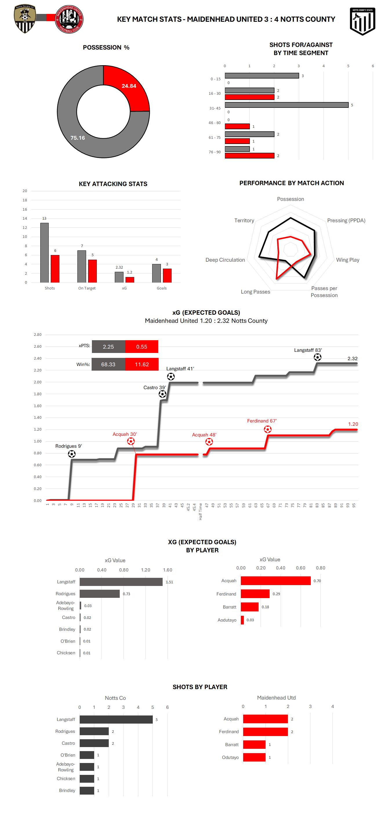 We mentioned the threat posed by Emile Acquah and whilst you would hope for better defending for his two tap-ins he was very much the key outlet for Maidenhead both centrally and more often than not down the channels. This is evident in the performance by match action radar above which shows Maidenhead were close to matching Notts for wing play, a metric that Notts normally dominate in.