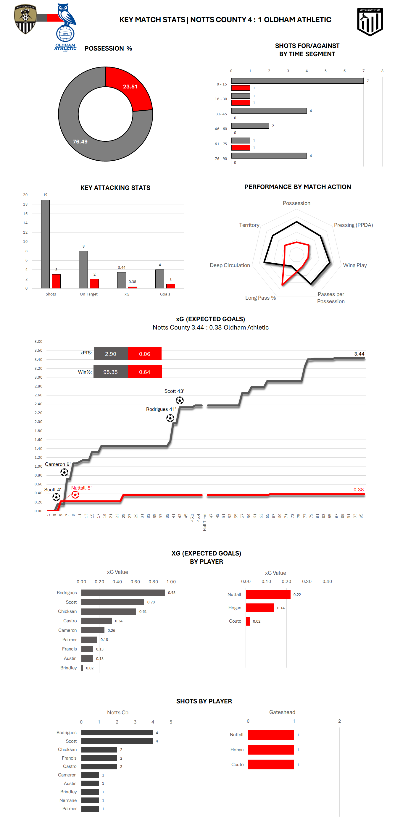 The topsy turvy opening to proceedings continued as the Magpies once again found themselves back on top. An Ed Francis free kick on 9 minutes saw Oldham keeper Magnus Norman save low to his right with a strong parry only to see Notts Skipper Kyle Cameron confidently pounce on the rebound, firing the ball home from a tight angle for his first goal of the season. From that point on Notts took complete control of the game and goals from Ruben Rodrigues and a second for Scott just before half time was enough to put the game to bed.