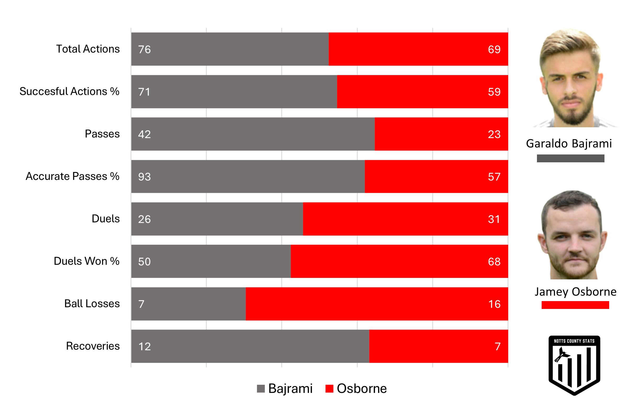Bajrami - 9 - Like many I walked out of Meadow Lane yesterday absolutely gushing over his performance. There wasn't a blade of grass he didn't cover and his stats, as highlighted above just confirm what a great game he had. MOTM.