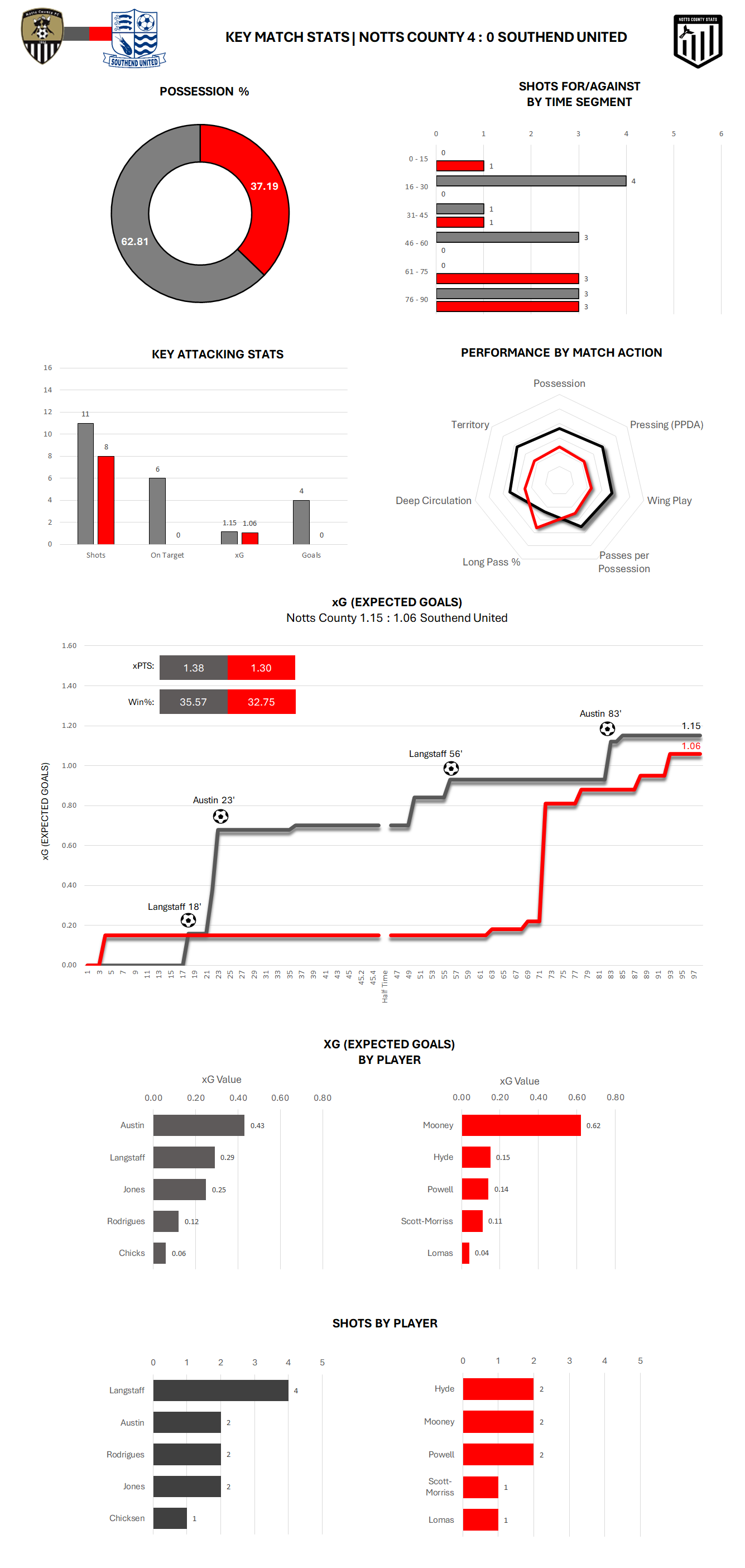Firstly, despite Notts seemingly cruising to a 4-0 win they fashioned just 3 chances more than Southend. This in itself could impact on the final xG totals being very close.