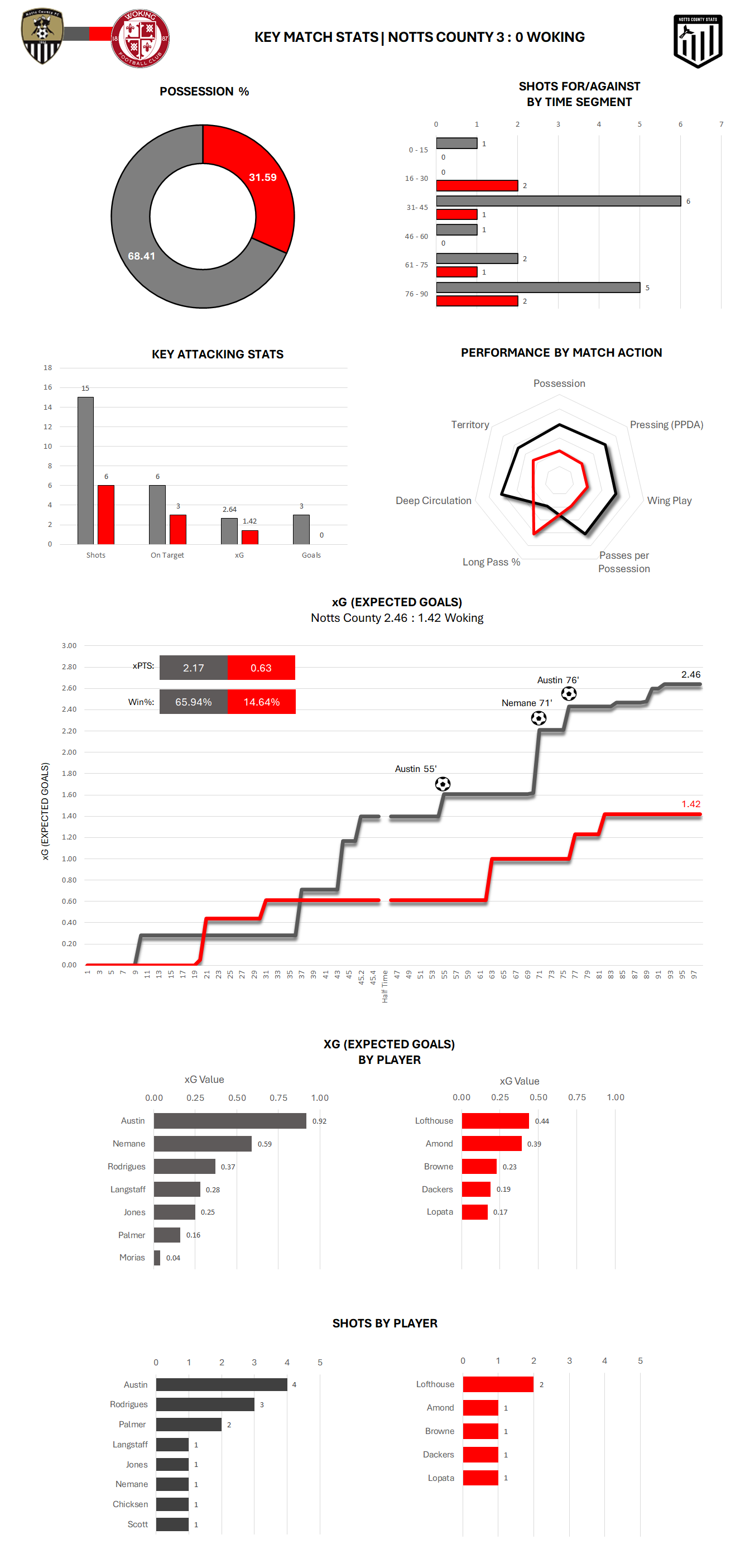 Man of the match Austin was the busier of the Notts players in front of goal with 4 shots, 2 goals, an assist and a total xG of 0.92.