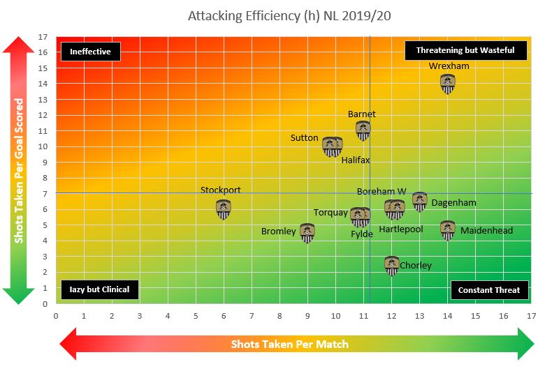 When looking at attacking efficiency we can determine whether we are clinical or wasteful in front of goal. In the two charts below we assess this efficiency both at home and away.