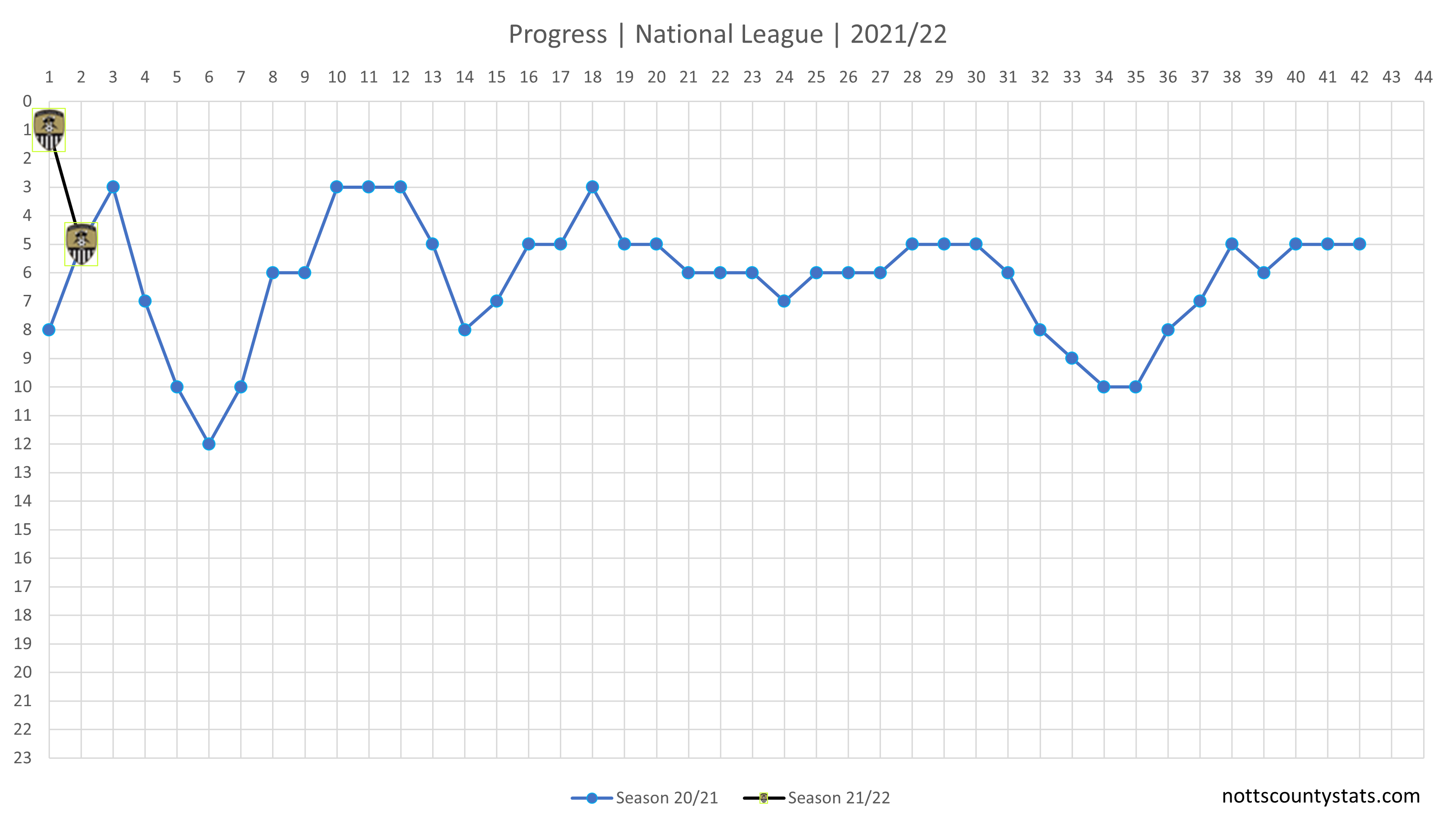 Progress after two games and a drop from 1st to 5th. Chart also shows progress for last season as a comparison.