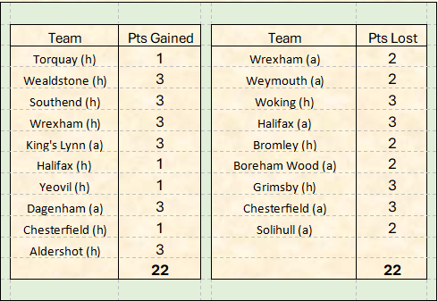 Of the 9 games listed for points lost from winning positions 6 of them were on the road. Of the 10 games where points were gained from losing positions 8 of those were at home. Just another set of stats to confirm how Notts have had issues away from Meadow Lane this season.