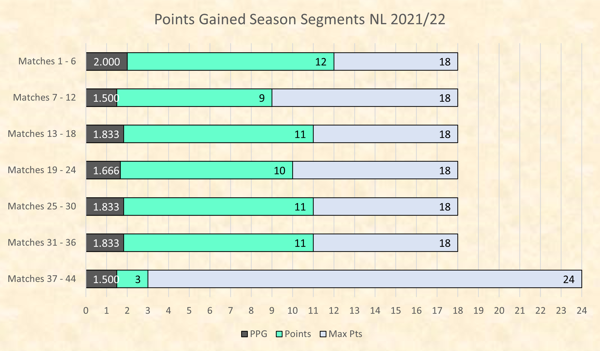 Six game segments updated. 3 Points from 2 games in this final 8 game segment.