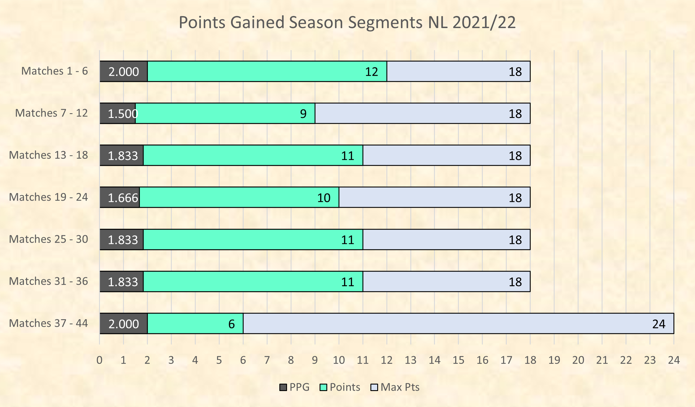 Six game segments updated. 3 Points from 2 games in this final 8 game segment.