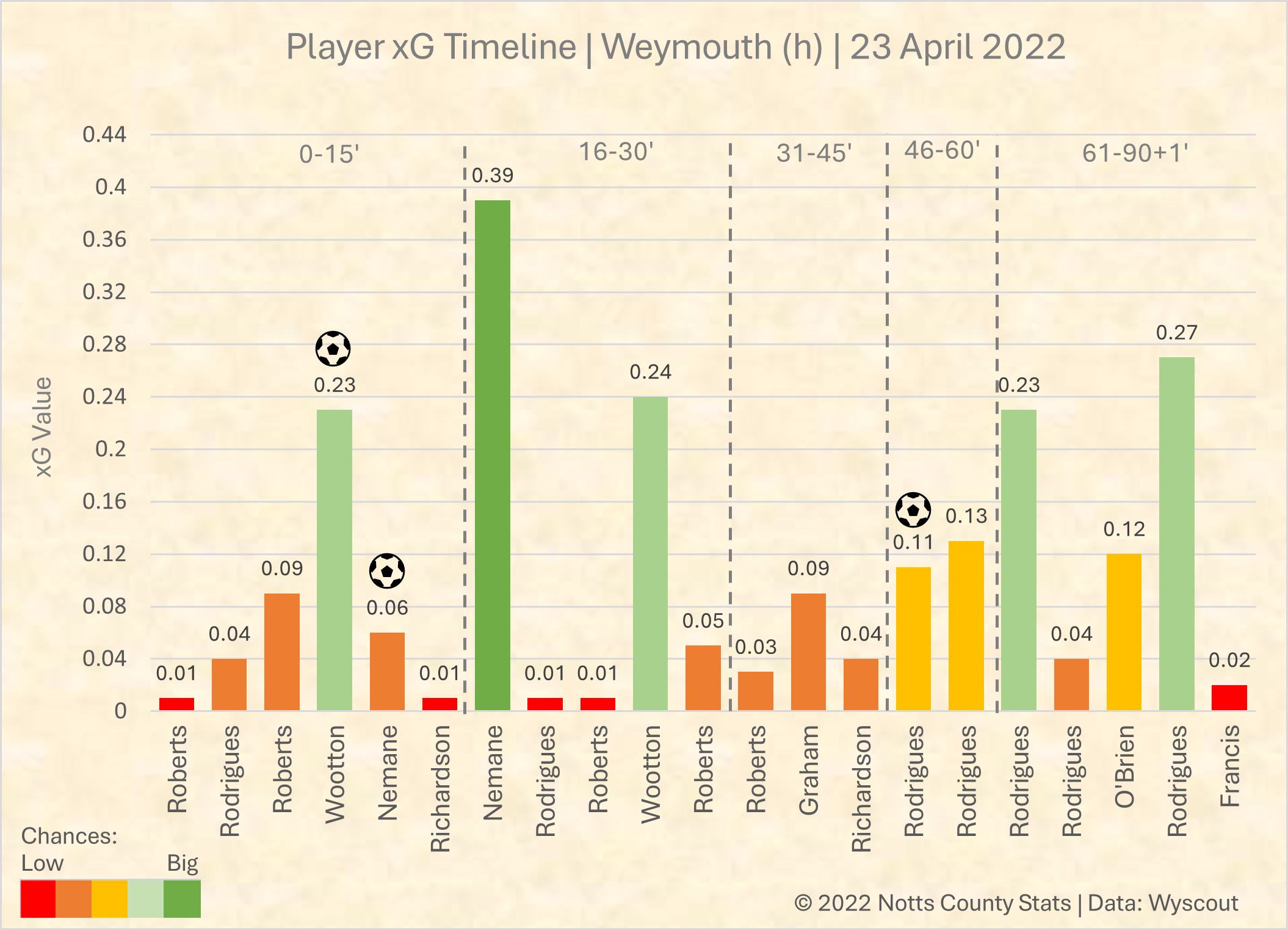 Player xG Stats and a change to the normal table. have decided to try and visualise each chance by player and timeline. This will be another way of identifying busier times of chance creation in the game as well as showing players individual chances.