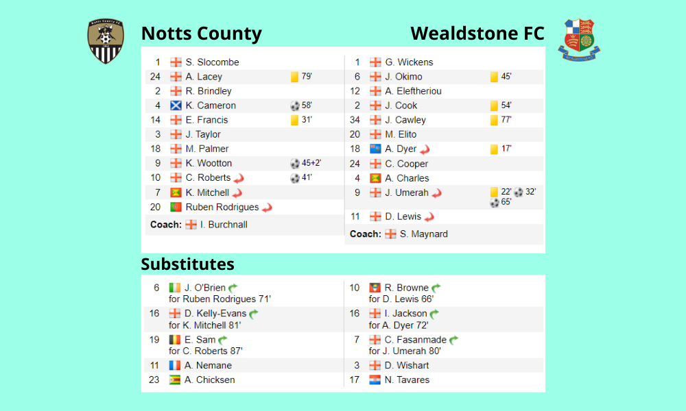 After this it was all Notts for the next 35-40 minutes scoring all three goals in that period of time. Wealdstone's second goal was essentially unexpected as they hadn't threatened the Notts goal since their opening goal. After this the game petered out somewhat although there was one big chance for Notts to make life a bit easier with about 20 minutes to go with Palmer spurning the opportunity to grab his first goal for the club.