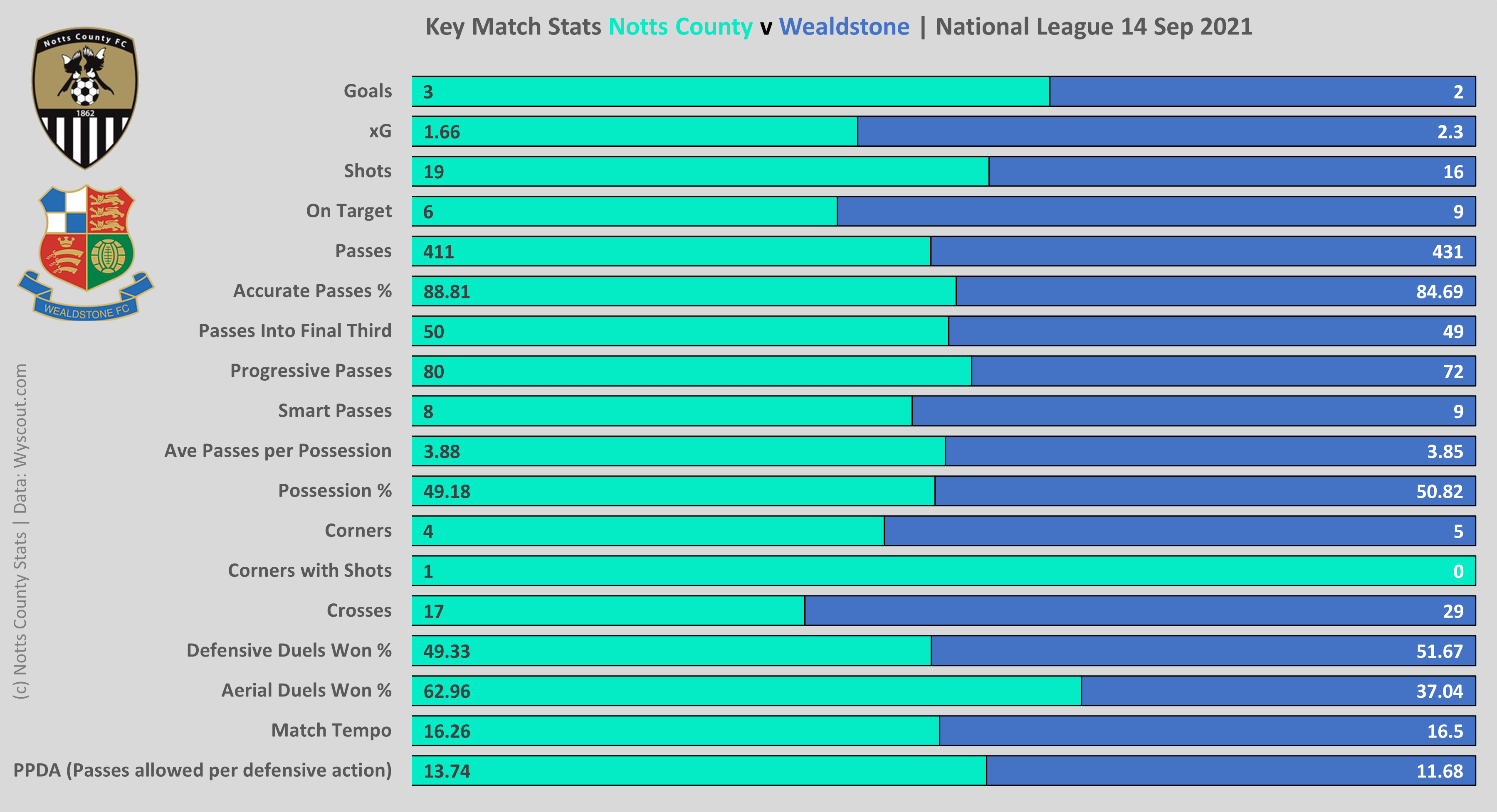 It's rare that any team has more possession or completes as many passes as Notts in a game but again The Stones were equal to the task. This again is further emphasised when analysing the number of passes allowed per defensive action (PPDA) with Wealdstone enjoying more passes in attack than Notts suggesting they were quicker at limiting passing opportunities but may have also played a part in Notts taking a slightly more direct approach at times.